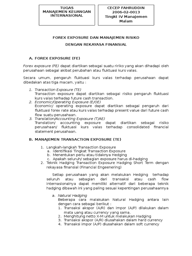 Menurut shapiro (1999:144) hedging particular currency exposure means estabilishing an offseting such whatever is lost or gained on the original currency exposure is exactly offset by corresponding foreign exchange gain on. Foreign exchange exposure refers to the risk associated with the foreign exchange rates that change frequently and can have an adverse effect on the financial transactions denominated in some foreign currency rather than the domestic currency of the company. Pasar valuta asing amanitanovi@uny.ac.id bank dan lembaga keuangan lain 188 a.